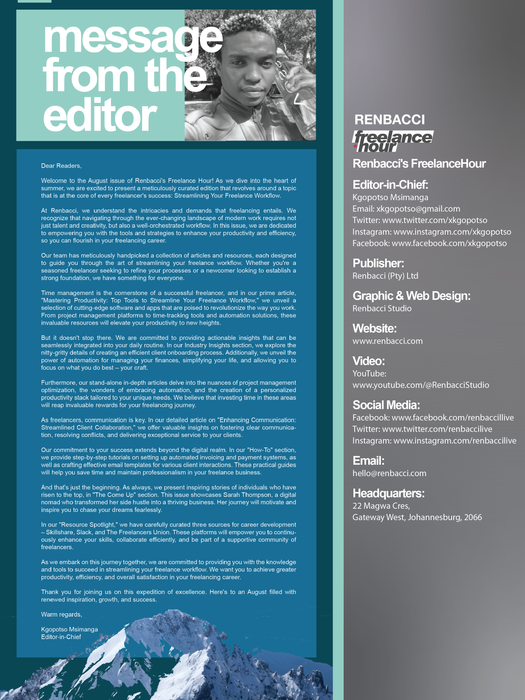 Unlock an exclusive opportunity to command attention in our magazine with full-page ad placements. Capture your audience, and make an indelible mark in the dynamic world of freelancing. Your message will be unmissable, reaching readers on every page. This prime advertising real estate is your canvas, and it's time for your brand to flourish.